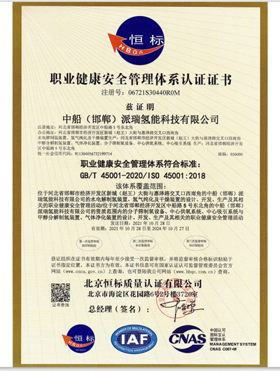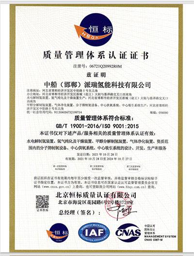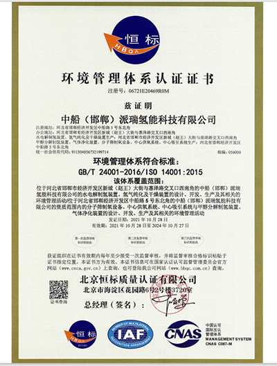 中國船舶重工集團公司第七一八研究所1998年通過GB/T19001質(zhì)量體系認證,2005年通過中國質(zhì)量認證中心的CCC認證,2008年通過環(huán)境和職業(yè)健康安全管理體系認證,實施QEO一體化管理。是世界較大的制氫研究、生產(chǎn)基地。